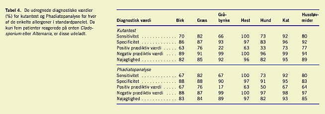 Ved hjælp af krydstabuleringer for resultaterne af de to allergitest for hvert enkelt standardallergen blev den diagnostiske sensitivitet, specificitet, positive og negative prædiktive værdi og nøjagtighed udregnet (Tabel 4). Ved sammenligning af de to systemer synes de at være ligeværdige for de fleste allergener og kan bruges til påvisning af en korrekt allergidiagnose (sensitivitet) i 70-100% af tilfældene. Ved negativ test fanges langt den overvejende del af de raske med en specificitet mellem 88% og 97% i begge systemer. Med begge systemer påvises positive reaktioner, der af en allergilæge bedømmes som værende klinisk stumme. I den sammenhæng er den positive prædiktive værdi for samtlige allergener under et for kutantest på 62% og for Phadiatopanalyse på 62%, hvilket betyder, at der i begge testsystemer fremkommer 38% falsk positive reaktioner. Langt hovedparten af de negative testudfald er dog overensstemmende med den kliniske diagnose. For de syv hyppigste allergener var 24 ud af 572 (4,2%) svar falsk negative ved kutantesten, og 26 ud af 572 (4,5%) svar var falsk negative ved Phadiatopanalysen (Tabel 4).