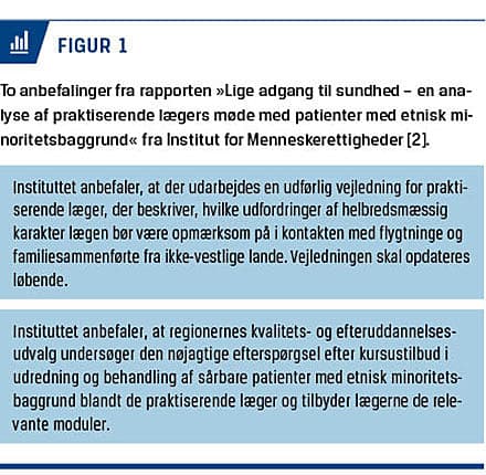 Langt de fleste praktiserende læger er uddannet i Danmark, og hovedparten beskæftiger sig primært med etniske danskere. Der er litteratur, der tyder på, at hospitalslæger mangler viden om patienter med etnisk minoritetsbaggrund [11], og de praktiserende læger føler sig udfordret på forskellige parametre og ønsker flere kursustilbud til generel opkvalificering i håndteringen af patientgruppen [2].