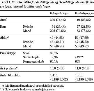 Af studiepopulationen på 434 læger blev fire læger ekskluderet fra undersøgelsen pga. praksissalg, orlov, afgang og sygdom. Herefter var der 330 (76,7%) besvarelser, hvoraf ti var blanke. Materialet bestod således af besvarelser fra 320 læger svarende til 74,4% (320/430). De deltagende kvinder i undersøgelse n var signifikant yngre og havde mindre anciennitet end de deltagende mænd (M-W-test, p<0,001). Bortfaldsanalysen (Tabel 1 ) viste, at de læger, der ikke besvarede spørgeskemaet, var statistisk signifikant ældre end de deltagende læger med en medianalder på 52 år for de ikke-deltagende læger mod 49 år for de deltagende læger (M-W-test, p=0,001), og at deres anciennitet var større med 11,0 år for de ikke-deltagende læger mod 10,0 år for de deltagende læger (M-W-test, p=0,030). Der var ikke statistisk signifikant forskel på de øvrige målte karakteristika.