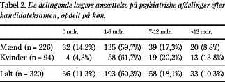 Flere mænd end kvinder havde ikke været ansat på en psykiatrisk afdeling (Tabel 2 ). Kvindernes ansættelsestid på psykiatriske afdelinger efter kandidateksamen var mediant seks måneder (3,0-9,3) mod fem måneder (3,0-7,0) for mændene (M-W-test, p=0,039). Den mediane ansættelsestid for gruppen af læger, der havde haft ansættelse på en psykiatrisk afdeling, var for kvinderne seks måneder (3-10) og for mændene seks måneder (3-8) (M-W-test, p=0,448).