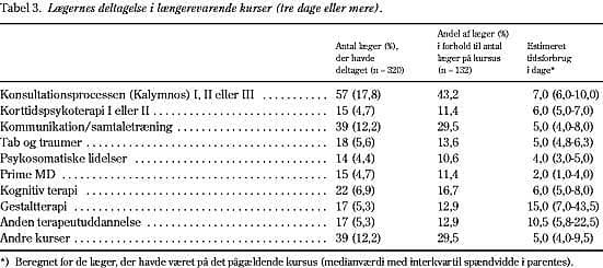I alt 132 læger (41,3%) havde deltaget i et eller flere længerevarende kurser i kommunikation eller samtaleterapi (Tabel 3 ). Af disse havde 57 læger (43,2%) været på de såkaldte Kalymnoskurser (konsultationsprocessen). Lægerne angav et tidsforbrug til længerevarende kurser på mediant 10,0 (6,0-20,0) dage.