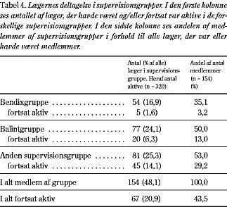 Mange læger ønskede tilknytning til en supervisionsgruppe. Godt halvdelen af de læger, der havde været medlem af en supervisionsgruppe, var ikke længere aktive. Årsagen til dette kender vi ikke, men den kunne være, at man i grupperne aftaler et forløb over en kortere årrække. En statusrapport fra Københavns Kommune om superviseret samtalebehandling i almen praksis pegede på, at et systematisk arbejde med samtaler medførte en læreproces, som havde konsekvens for lægens øvrige patientkontakter, medførte større tilfredshed med arbejdet og blev beskrevet som ressourcegivende (17).