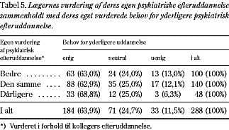 Der var ingen forskel på vurderingen af egen psykiatrisk efteruddannelse mellem grupper af læger med forskelligt oplevet behov for yderligere uddannelse (Spearman, p=0,374) (Tabel 5). Kun tre læger, der vurderede, at deres efteruddannelse på området var dårligere, fandt ikke, at de havde behov for yderligere efteruddannelse.