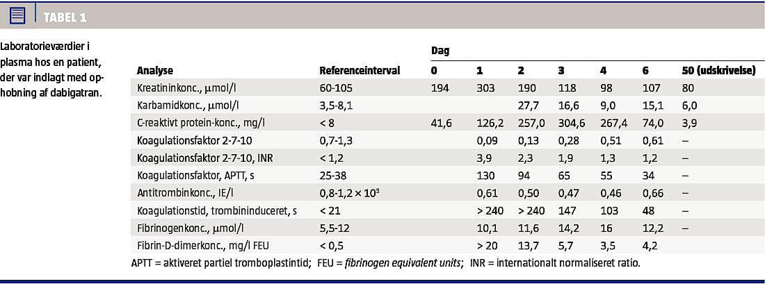 P-kreatininniveauet steg til 303 mikromol/l, diuresen aftog, patienten var svært overhydreret, og hjerteinsufficiensen tiltog med et fald i uddrivningsfraktion til 20-30%. Der var indikation for kontinuerlig venovenøs hæmofiltration. Før påbegyndelse viste koagulationstal F (II + VII + X) 0,09, og aktiveret partiel tromboplastintid var 122 sekunder. De øvrige standardkoagulationsanalyser viste også tegn på et svært påvirket koagulationssystem (Tabel 1). I samarbejde med Center for Hæmofili og Trombose, Aarhus Universitetshospital, blev det konkluderet, at der var tegn på dabigatranforgiftning pga. tiltagende nyreinsufficiens gennem længere tid samt den aktuelle urosepsis, og dabigatran blev derfor seponeret.