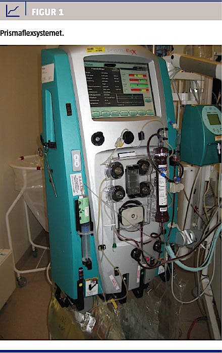 Der findes i dag ikke en antidot til dabigatran. Dabigatranforgiftning behandles sædvanligvis med forceret diurese evt. ved brug af dialyse. Dabigatran er fuldt dialysabelt, men den kliniske effekt af dette er endnu ikke veldokumenteret. I dette tilfælde var patienten oligurisk, og der var påbegyndt kontinuerlig dialyse ved hjælp af Prismaflexsystemet, Figur 1. For at opnå samme effekt som ved forceret diurese blev ultrafiltration over dialyseapparatet øget ved at øge prædilution.