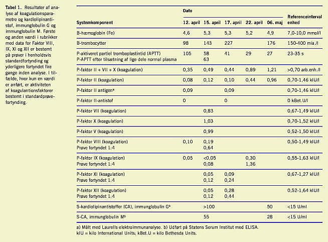 En 15-årig pige med fem måneder varende symptomer på SLE blev indlagt på et sygehus med svær anæmi, svært forlænget aktiveret partiel tromboplastintid (APTT), nedsat faktor II + VII + X-aktivitet, trombocytopeni og påvirket nyrefunktion med proteinuri. Hun havde forinden haft kraftig menstruationsblødning i to uger og intermitterende næseblødning i en uge. Hun fik to portioner erytrocytsuspension (SAGM) og blev derefter overflyttet til H:S Rigshospitalet. Her var B-hæmoglobin, trombocyttal, APTT og faktor II + VII + X fortsat abnorme (Tabel 1 , 12. april). Direkte antihumanglobulintest (DAT) viste svagt positivt resultat, men reticulocyttal og laktatdehydrogenase (LD) var normale. Baseret på klassifikationskriterier fra American College of Rheumatology blev diagnosen SLE og lupusnefrit (WHO-grad IV) verificeret. Supplerende undersøgelser viste, at de abnorme værdier for APTT og faktor II + VII + X skyldtes LA og autoantistof mod frit protrombin (Tabel 1, Diskussion). Desuden var værdierne for CA forhøjede. Kortikosteroid (CS)-behandling blev straks påbegyndt (først peroralt og siden kombineret med intermitterende højdosis intravenøs (i.v.) pulsbehandling) og blev suppleret med 310 g SAGM, rekombinant faktor VIIa (eptacog alfa (activated)) 180 μg/kg i.v., gentaget efter toenhalv time samt tre dages behandling med tranexamsyre. Blødningen ophørte det første døgn, og koagulationsparametrene normaliseredes inden for få uger med svind af LA og hypoprotrombinæmien. CS-behandlingen blev efter toenhalv uge suppleret med intermitterende i.v. cyclofosfamidbehandling. Patienten var stadig anæmisk, hvorfor man to, fire og otte uger efter indlæggelsen gav henholdsvis 286, 599 og 540 g SAGM, hvilket øgede B-hæmoglobin med 1,8-2,3 mmol/l fra 4,4-4,9 mmol/l. Efter to måneder var B-hæmoglobintallet normalt eller kun let nedsat.