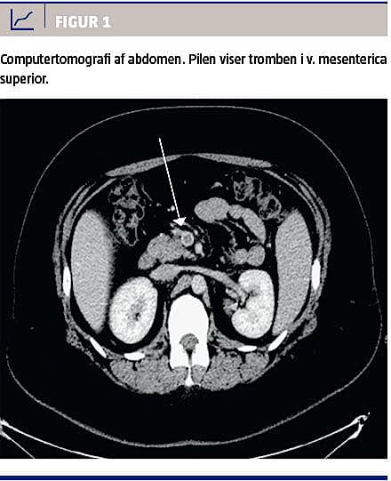 Ved den objektive undersøgelse fandt man kvinden upåvirket, overvægtig med et body mass index på 39 kg/m2 og med diffus abdominal ømhed uden peritoneal reaktion. Biokemisk fandt man forhøjet levertal i følgende koncentrationer med referenceintervaller angivet i parentes: basisk fosfatase på 159 E/l (35-105 E/l), laktatdehydrogenase på 469 E/l (105-205 E/l) og alaninaminotransferase på 95 E/l (10-45), samt forhøjet D-dimer på 3,6 mg/l (< 0,5 mg/l) og S-hCG på 555 IE/l (< 3). En abdominal ultralydskanning, som blev foretaget på mistanke om kolecystolitiasis viste splenomegali. En efterfølgende computertomografi af abdomen viste en trombe intrahepatisk og i v. mesenterica superior (Figur 1). Man påbegyndte behandling med tinzaparin 10.000 IE × 2 daglig og warfarin; p-pillerne blev seponeret. Pga. det forhøjede S-hCG-niveau blev kvinden henvist til gynækologisk afdeling, hvor man ved ultralydskanning fandt en intrauterin levende graviditet svarende til uge 6. Patienten ønskede abort, og der blev foretaget kirurgisk abort i lokalbedøvelse otte dage efter initiering af den antikoagulerende behandling. International normaliseringsratio (INR) på operationsdagen var 1,9. Indgrebet forløb uden komplikationer. Kvinden blev udskrevet til warfarinbehandling i seks måneder og nærmere trombofiliudredning og genetisk udredning.
