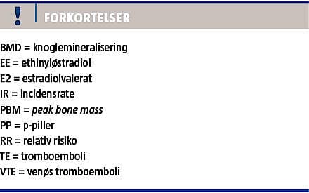 Hvorvidt brug af PP i teenageårene medfører nedsat BMD-tilvækst og dermed lavere PBM, og om en evt. forskel er vedvarende og klinisk relevant, vides ikke. Man har i få studier påvist marginalt nedsat BMD hos PP-brugere. Ud fra den nuværende viden er det nærliggende at anbefale PP med lavdosis-EE og andengenerationsgestagen til teenagere. Endvidere bør man forsøge at begrænse pauser i brugen af PP, da risikoen for VTE er størst ved opstart.