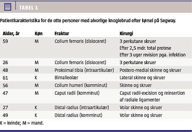 På et år har vi opereret otte patienter, som havde fået alvorlige knoglebrud efter kørsel på Segway i en forlystelsespark (Tabel 1). Idet denne ulykkestype er ny i Danmark, har vi fundet det relevant at omtale to patienter, der pådrog sig hoftefrakturer. Disse frakturer er sjældne efter ulykker hos i øvrigt raske, yngre personer.