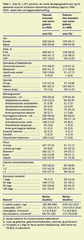 Afsnittet om antibiotisk behandling i Medicinfortegnelsen [5] var rettesnor for den empiriske behandling i studieperioden. Gentamicin var det hyppigst anvendte AG i en dosis på 3-4 mg/kg × 1 dagligt [6]. Oplysninger om AG-behandling i bakteriæmidatabasen blev valideret ved journalgennemgang.
