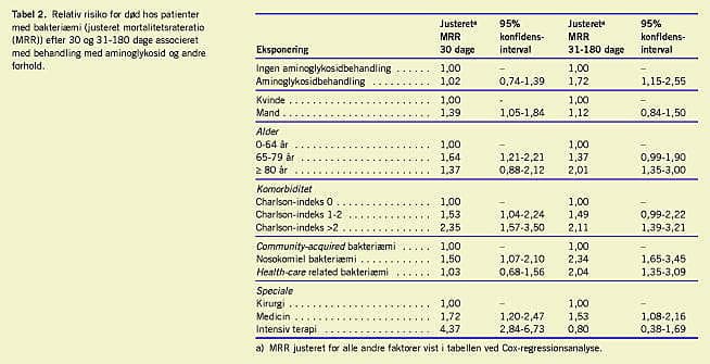 Der er sat spørgsmålstegn ved brugen af aminoglykosider (AG) til behandling af patienter med sepsis på baggrund af flere metaanalyser [1-3]. Behandling med AG i kombination med et betalaktamantibiotikum er gået af brug i en række lande, men endnu er det ikke sket i Danmark. Hvorvidt det bør ske, afhænger af, om resultaterne af randomiserede antibiotikaforsøg i de nævnte metaanalyser kan generaliseres til danske forhold. Vi gennemførte et kohortestudie for at undersøge sammenhængen mellem AG-behandling, dødeligheden inden for de første 180 dage og risikoen for nyrepåvirkning hos bakteriæmipatienter, der fik dækkende empirisk antibiotisk behandling med eller uden AG.