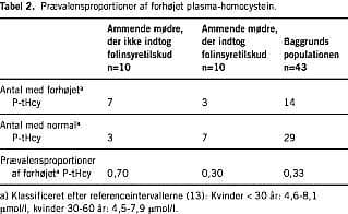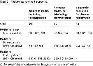 Resultater: Gruppen af ammende mødre, der ikke indtog folinsyretilskud, havde en højere prævalens af forhøjet plasma-homocystein (70%) end gruppen af ammende mødre, der indtog folinsyretilskud (30%), og baggrundspopulationen (33%). Forskellen mellem gruppen af ammende mødre, der ikke indtog folinsyre, og gruppen af ammende mødre, der indtog folinsyre, var ikke signifikant (p=0,12). Der var signifikant forskel mellem gruppen af ammende mødre, der ikke indtog folinsyre, og baggrundspopulationen (p=0,02).