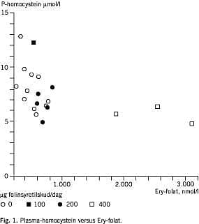 P-tHcy afhang af, om de ammende mødre indtog folinsyretilskud. Tre af de ammende mødre, som indtog tilskud på 400 μg folinsyre/dag, havde markant høje Ery-folatkoncentrationer (Fig. 1 ).