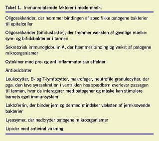 Modermælk indeholder en lang række komponenter, som potentielt kan beskytte barnet mod infektioner og påvirke barnets immunsystem (Tabel 1 og Tabel 2). De specifikke virkningsmekanismer og deres kliniske relevans er dog ikke klarlagt for alle disse komponenter. Amning giver barnet passiv beskyttelse, ved at modermælken gennem sit indhold af bl.a. sekretorisk immunglobulin A (SIgA) beskytter slimhinderne i de øvre luftveje og mave-tarm-kanalen mod patogener og dermed nedsætter risikoen for invasive infektioner. Derudover stimulerer amning også barnets eget immunsystem [6]. Det vides ikke, hvilke faktorer i modermælken der er årsag til denne aktive stimulation af barnets eget immunsystem [6]. For nogle vacciner er antistof- og T-celle-responset større hos ammede børn. Desuden har man i et dansk studie påvist, at thymus hos fire måneder gamle, raske børn er dobbelt så stor hos ammede som hos ikkeammede børn [7]. Hvad mekanismen er, og hvad det betyder på længere sigt, ved man dog ikke. Ammede børn har også et højere niveau af SIgA i urinen end børn, der ikke er ammet. Hos forsøgsdyr er det påvist, at lymfocytter fra modermælken kan optages i cirkulation hos den nyfødte, hvilket resulterer i en tolerans over for maternelle antigener. Det kunne være årsagen til, at personer, der bliver transplanteret med en maternel nyre, har mindre risiko for afstødning, hvis de er blevet ammet i barndommen [6]. Det er dog ikke påvist hos mennesker, at leukocytter i modermælken bliver optaget i barnets cirkulation.