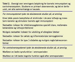 I denne første af to oversigtsartikler fokuseres der på betydningen af amning for immunsystemet og centralnervesystemet. Modermælk indeholder immunfaktorer, der beskytter barnet mod infektioner og stimulerer barnets immunsystem og muligvis medvirker til en lavere forekomst af immunrelaterede sygdomme såsom visse allergiske lidelser, cøliaki, type 1-diabetes og inflammatoriske tarmsygdomme. Ammede børn har en bedre synsstyrke i det første leveår og en lidt bedre kognitiv funktion senere i livet.