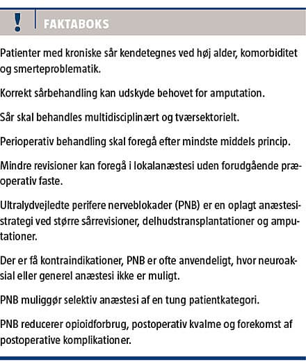 I takt med udbredelsen af ultralydvejledte perifere nerveblokader (PNB) er der nu flere muligheder til rådighed for at sikre selektiv anæstesi til større sårrevisioner, delhudstransplantationer og amputationer. Formålet med denne strategi er at skåne den ofte ældre svækkede patient for postoperative komplikationer [3].