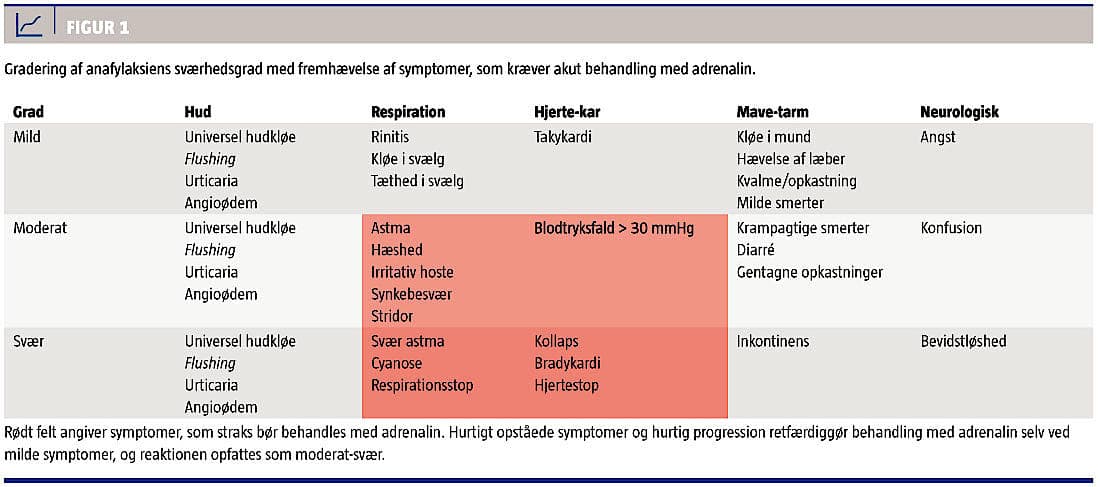 Figur 1 viser kliniske symptomer fra forskellige organsystemer og gradering af anafylaksiens sværhedsgrad.