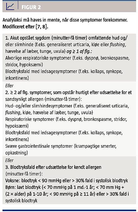 Diagnosen anafylaksi stilles klinisk og må altid haves in mente ved akut indsættende symptomer fra flere organsystemer i forbindelse med udsættelse for kendte allergener som lægemidler, insektstik eller fødevarer (Figur 2) [2, 4, 5, 7, 8, 10, 12].
