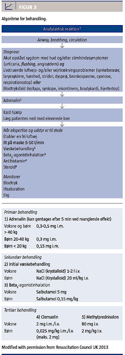 Erkendelse af den anafylaktiske reaktion og indledning af kurativ behandling uden unødig forsinkelse kan være livreddende. På baggrund af symptomernes livstruende karakter er behandlingen ikke baseret på klinisk kontrollerede forsøg [7-10,13-16]. I Figur 3 angives en algoritme for behandling.