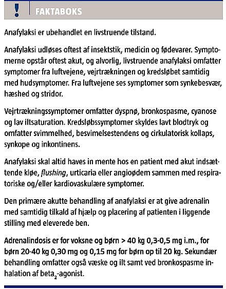 Anafylaksi er en af de mest akutte, og potentielt livstruende, medicinske tilstande. Den enkelte læge vil sjældent møde denne tilstand, men når det sker, forventes det, at lægen umiddelbart kan diagnosticere tilstanden og behandle adækvat [1]. Rent behandlingsmæssigt er anafylaksi – når behandlingen indsættes i den tidlige fase – en yderst taknemmelig tilstand at behandle, og oftest svinder symptomerne uden senskader [2]. Omvendt vil ubehandlet eller for sent erkendt anafylaksi kunne medføre hjertestop eller efterlade irreversible skader [3]. På trods af at behandlingen er enkel og effektiv, er det ikke usædvanligt at se både utilstrækkelig og uhensigtsmæssig behandling.