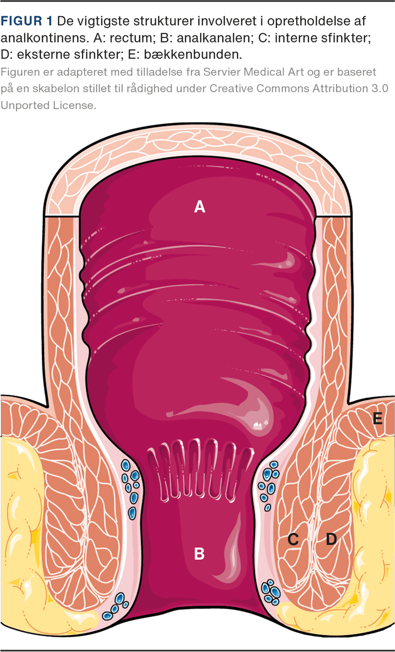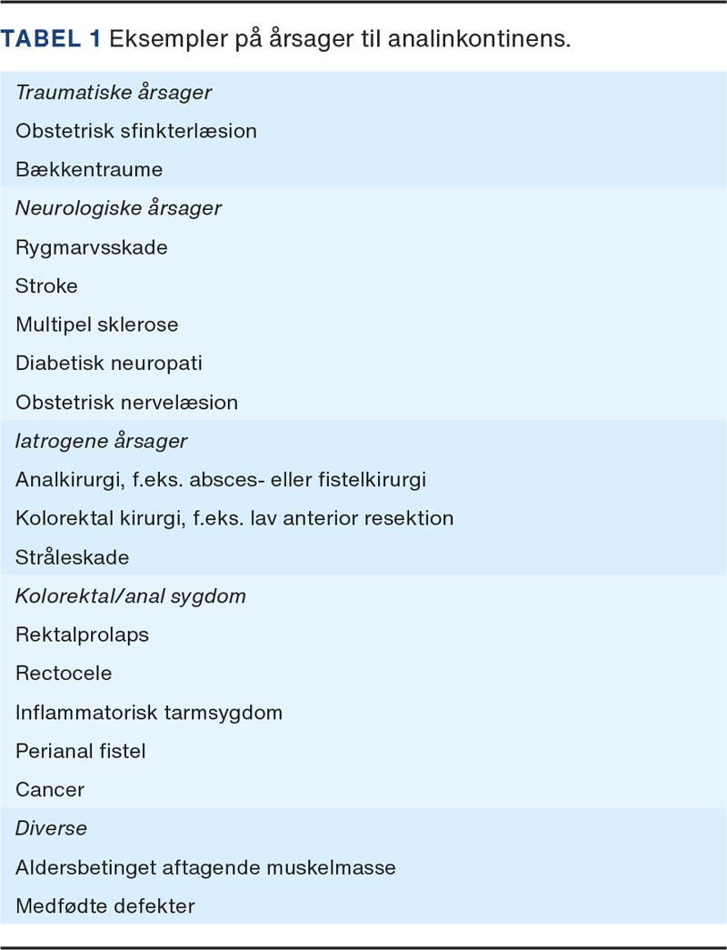 Ufrivillig afgang af fæces eller flatus kan være socialt invaliderende, uafhængigt af graden af inkontinens [1]. Analinkontinens er manglende evne til at holde på fæces og/eller flatus, og fækalinkontinens betyder manglende evne til at holde på fæces [2]. Iht. Rom IV-kriterierne skal symptomerne have været persisterende eller tilbagevendende gennem mindst tre måneder for at opfylde de diagnostiske kriterier for voksne [3]. Prævalensen af analinkontinens blandt voksne blev tidligere estimeret til omkring 2% [4], men nyere studier rapporterer prævalenser helt op til 7,7% for fækalinkontinens alene [5, 6]. Hyppigheden stiger med alderen, og kvinder udgør størstedelen af patienterne. Analinkontinens kan skyldes en række forskellige tilstande (Tabel 1) og kan opstå som følge af enhver forstyrrelse af den normale kontinensfunktion (Figur 1). Behandlingen følger dog i store træk de samme principper uanset ætiologi. Analinkontinens har ofte gennemgribende konsekvenser for de berørte og deres livskvalitet [7], men det er desværre stadig et tabubelagt emne for både patienter og sundhedsprofessionelle [8], hvorfor tilstanden formentlig er underdiagnosticeret.