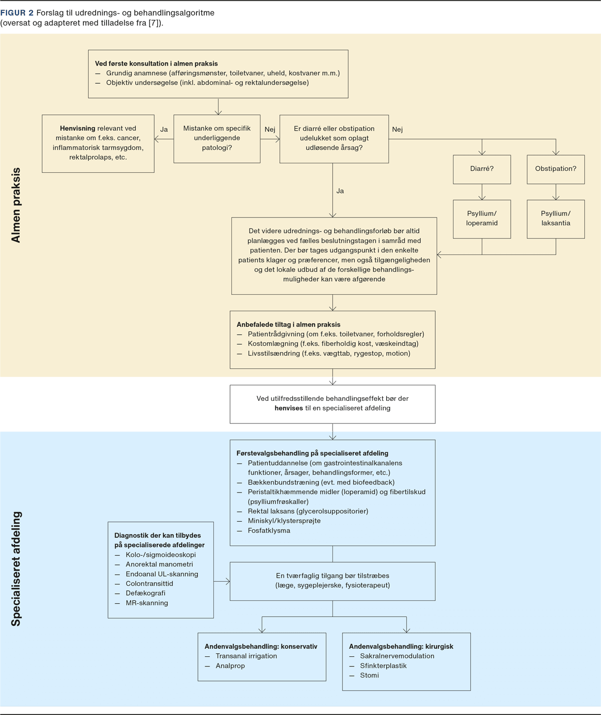 En udrednings- og behandlingsalgoritme er skitseret i Figur 2. Den initiale udredning starter med en anamnese, der inkluderer oplysninger om afføringsmønster og -konsistens, toiletvaner, omfang og hyppighed af inkontinensepisoder, evt. samtidig urininkontinens, kost- og drikkevaner, kirurgisk og obstetrisk historik samt sociale og personlige konsekvenser for patienten og vedkommendes behov for hjælpemidler. Hvis muligt anbefales det at afklare, hvorvidt patientens inkontinensepisoder er forudgået af afføringstrang (urge-inkontinens), om episoderne er uvarslede (passiv inkontinens), eller om der i stedet er en gradvis siven af en mindre mængde afføring (soiling). Der findes flere simple spørgeskemaer om afføringsinkontinens, så sværhedsgraden nemt kan objektiviseres, og skemaerne kan anvendes til måling af behandlingseffekten [9, 10]. Den objektive undersøgelse inkluderer abdominal og rektal undersøgelse [6].