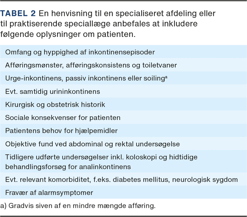 Foreligger der herefter mistanke om specifik underliggende patologi, f.eks. cancer, inflammatorisk tarmsygdom eller rektal prolaps, henvises patienten til den relevante afdeling [11]. Selv om analinkontinens kan skyldes en underliggende cancer, skal det bemærkes, at den absolutte risiko for cancer hos inkontinente patienter er lav [12]. Patienten bør henvises til videre udredning og behandling for analinkontinens på en specialiseret afdeling, hvis basale konservative behandlingstiltag ikke giver tilfredsstillende effekt [13]. Se Tabel 2 for forslag til, hvilke oplysninger en henvisning kan indeholde. Den videre udredning i specialiseret regi kan inkludere: 1) anorektal manometri til trykmåling i analkanalen under både kontraktion og hvile. Samtidig undersøges sensibiliteten i rectum, og der kan laves en væskeretentionstest [14]. 2) Endoanal UL-undersøgelse foretages ved mistanke om sfinkterruptur, og undersøgelsen har høj sensitivitet for detektion at sfinkterlæsioner. Digital rektaleksploration er ikke tilstrækkeligt til afklaring af dette [13]. 3) Øvrige undersøgelser er sigmoideo- eller koloskopi, røntgendefækografi, neurofysiologiske undersøgelser, MR-skanning af bækkenet samt måling af colontransittid [14].