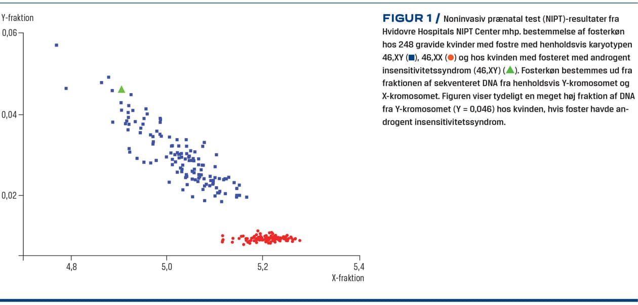 I graviditeten var der udført førstetrimesterskanning ved gestationsalder 12 uger + 6 dage. Ud fra kvindens alder, nakkefoldens størrelse og resultaterne fra doubletesten blev risikoen for trisomi 21 hos fosteret beregnet til 1:200. Den gravide blev herefter tilbudt yderligere undersøgelser og valgte NIPT. NIPT-analysen blev foretaget som helgenomsekventering med metoden massive parallel sequencing. Fosterkønnet blev bestemt ud fra antallet af DNA-sekvenser fra både X- og Y-kromosomet (Figur 1). NIPT viste normale forhold for kromosom 21, 18 og 13 samt køn: dreng.