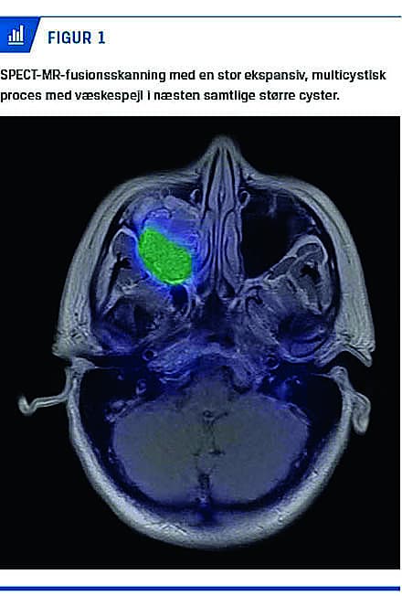 En CT viste en stor, delvist forkalket tumor, der havde cystiske komponenter og forskød maxilvæggene, men der var ingen ossøs gennemvækst. På en MR-skanning fandt man en stor ekspansiv, multicystisk proces med væskespejl i næsten samtlige større cyster (Figur 1). En histologisk undersøgelse gav den endelige diagnose: aneurismal knoglecyste.