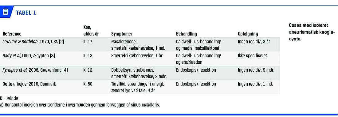 Aneurismatisk knoglecyste er en sjælden, godartet, cystisk knoglelæsion. Ætiologien er ukendt, og læsionen kan ses hos personer i alle aldre, men er hyppigst hos børn og unge under 20 år. Incidensen estimeres til at være 0,15 pr. 100.000. Det svarer til ca. ni om året i Danmark. Langt den hyppigste lokalisation er rørknoglernes metafyser og de posteriore elementer af vertebrae [1]. Kun ca. 2% af aneurismale knoglecyster forekommer i øre-næse-hals-regionen, og her er langt den hyppigste lokalisation kæberne. Histologisk drejer det sig om en læsion, der er opbygget af blodfyldte hulrum adskilt af bindevævsstrøg, der indeholder fibroblaster og flerkernede kæmpeceller med interstitiel aflejring