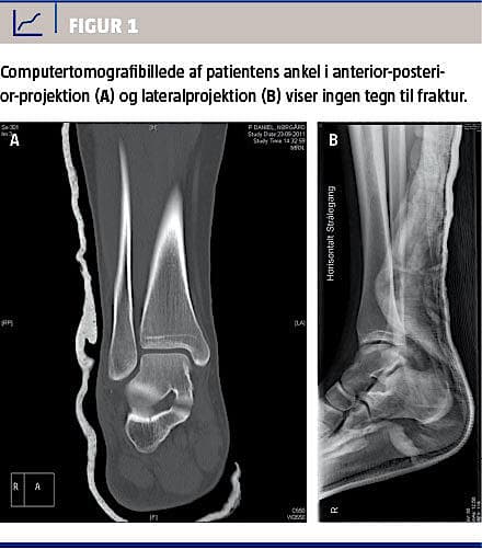 En 17-årig normalvægtig, fysisk aktiv, tidligere rask dreng blev indbragt til skadestuen efter at være hoppet op imod en anden person (chestbodding) og i nedspringet være landet forkert på højre fod. Objektivt sås en tydelig fejlstilling i ankelleddet, manglende puls i a. dorsalis pedis, forlænget kapillærrespons og manglende sensorik i tæerne. Han fik morfin og stesolid, og anklen blev reponeret; øjeblikkeligt fremkom der kapillær respons, god puls i a. dorsalis pedis og senere også normal sensibilitet i hele foden. En efterfølgende røntgenundersøgelse viste ingen tegn på fraktur, hvorfor der blev foretaget en kontrol-computertomografi (CT) også uden tegn på fraktur (Figur 1). CT’en viste lukkede epifyseskiver. Patienten blev behandlet på skadestuen og fik anlagt en Walkerbandage, som han skulle bære i seks uger, og der blev påbegyndt en tidages dicloxacillinbehandling. Patienten kom til kontrol i ambulatoriet efter en uge, hvor man fandt lettere atrofi af højre lægmuskulatur, ekstensionsdefekt på 5-10 grader og en fleksionsdefekt på 10-15 grader. Der var ingen løshed i anklen, ingen ossøs palpationsømhed, god puls i a. dorsalis pedis og normal sensibilitet. Patienten blev instrueret i restriktivt genoptræningsregime, ingen hoppen, ingen træning på blødt underlag og ingen voldsom sportstræning.