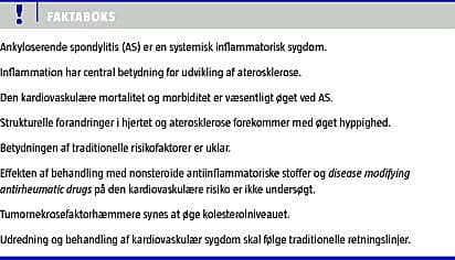 Ankyloserende spondylitis er en systemisk inflammatorisk sygdom, der primært afficerer det aksiale skelet. Sygdommen er associeret med øget kardiovaskulær morbiditet og mortalitet og morbiditet. Dette tilskrives strukturelle forandringer i hjertet og aterosklerose sekundært til inflammation. Betydningen af traditionelle kardiovaskulære risikofaktorer og antiinflammatorisk behandling er uklar. Tumornekrosefaktorhæmmere synes at øge kolesterolniveauet. En vurdering af den kardiovaskulære risiko bør overvejes hos den enkelte patient. Håndtering af kardiovaskulære risikofaktorer bør følge almindelige retningslinjer.