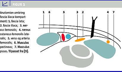 Patienter med hoftenære frakturer og femurfrakturer modtages ofte i skadestuen med alvorlige smerteklager [1]. Perifer nerveblokade til smertebehandling reducerer intensiteten af patienternes smerte og reducerer behovet for parenteral analgesi [2, 3]. Fascia iliaca-kompartment blokade (FIC-blok) er en nerveblokering af grene af plexus lumbalis og består i indsprøjtning af lokalanalgetika i et hulrum, der ligger profundt for fascia iliaca på lårets forside. FIC-blok giver i randomiserede kliniske undersøgelser bedre smertekontrol end systemiske opioider [2, 4, 5]. Det er også muligt at opnå smertedækning med nervus (N.) femoralis-blok [6]. Denne metode er imidlertid mere ressourcekrævende og kan være mere teknisk krævende. FIC-blok er lige så effektivt som N. femoralis-blok [7], og nyere studier har vist, at FIC-blok udført af yngre læger har en sufficient smertelindrende effekt og yderst få bivirkninger, hvorfor proceduren er egnet til udførelse af en yngre læge på en almindelig skadestue [8, 9]. FIC-blok er derfor i de senere år blevet en hverdagsprocedure i de danske akutmodtagelser og skadestuer og bliver efterhånden udført af de yngste læger, som modtager patienterne.