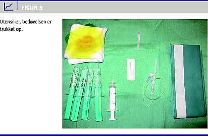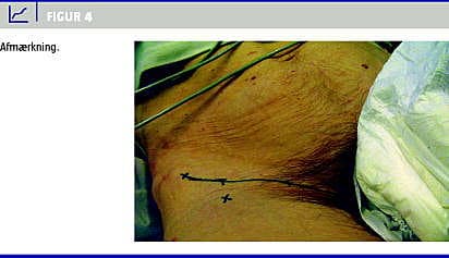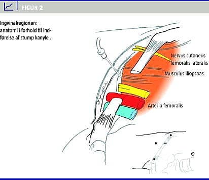 Inden man punkterer huden, sikrer man sig, at det valgte indstikssted ligger rigtigt i forhold til arteria femoralis (Figur 2). Herefter foretages lokalbedøvelse af huden med 2 ml lidocain med en stor kanyle (rød). Som ve d alle mindre indgreb kan det diskuteres, om lokalbedøvelse er nødvendig. Vores erfaring er, at patienterne er glade herfor.