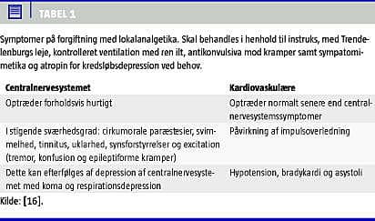 Smerter og ømhed ved punkturstedet er almindeligt et par dage efter proceduren. Alvorlige komplikationer er særdeles sjældne og omfatter overdosering eller intravaskulær injektion. Begge disse komplikationer kan undgås ved at aspirere under injektion samt ved at observere patienten for tegn på overdosering (Tabel 1 ). Vedvarende paræstesier i nervus femoralis' innervationsområde er sjældne bivirkninger, der er rapporteret af 0,03% [15].