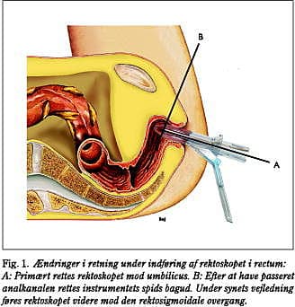 Rektoskopet indføres med obturator, velindsmurt i eksplorationscreme. Når skopet er ført gennem analkanalen (3-4 cm) fjernes obturatoren, og vinduet lukkes/påsættes, hvorefter skopet føres videre frem mod venstre og nedad og derefter fremad under synets vejledning og under hensyntagen til, at lumen primært findes anteriort i retningen mod venstre (Fig. 1 ). Er det primære formål med undersøgelsen tumordiagnostik, indblæses samtidigt luft for at bedre oversigten. Hele rectum, dvs. 18-20 cm, inspiceres. Den detaljerede inspektion af rektalslimhinden sker under tilbagetrækningen af skopet.