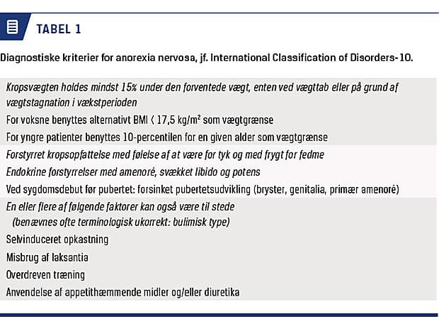 Anorexia nervosa (AN) er en psykiatrisk lidelse, hvis kernekriterium er angst for normalvægt og et selvpåført vægttab til mindre end 85% af forventet legemsvægt. De diagnostiske kriterier for AN ses i Tabel 1. Man skelner mellem to anorektiske undertyper, en restriktiv, hvor man blot begrænser kalorieindtaget og en bulimisk type, hvor man også har udrensende adfærd (opkastninger, misbrug af afføringsmidler, brug af vanddrivende medicin og tvangsmotion).