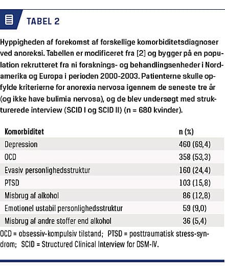 Patienter med AN har højere prævalens af obsessiv-kompulsiv tilstand (OCD), angsttilstande og socialfobi end patienter med andre spiseforstyrrelser [16], og lige under to tredjedele af de spiseforstyrrede patienter opfylder de diagnostiske kriterier for angstlidelse. Den hyppigst forekommende er OCD (Tabel 2). Omkring 40% debuterer med angstlidelser i barndommen, heraf 23% med OCD, 13% med socialfobi og 10% med specifik fobi. Samtidig er det vigtigt at understrege, at kvinder, der tidligere har haft AN, er helbredt for deres spiseforstyrrelse og aldrig har haft en angstdiagnose, stadig året efter har et højere niveau af angstsymptomer og undgåelsesadfærd end raske kvinder [17].