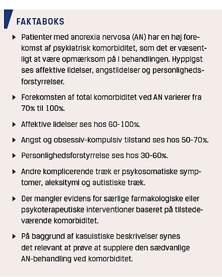 AN og andre psykiatriske sygdomme, herunder også de differentialdiagnostiske overvejelser, som det kan give anledning til. Ifølge en række studier er omfanget af komorbiditet ved AN meget stort. Der er fundet komorbiditet i helt op til næsten 90% af tilfældene. I Tabel 2 ses hyppighederne af komorbiditet inden for de store psykiatriske sygdomsgrupper [1]. De fleste publicerede behandlingsprogrammer er udformet til de rene diagnostiske udgaver af spiseforstyrrelser [1].