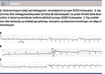 Der blev givet i alt syv DC-stød, hvorimellem patienten havde ventrikulær takykardi/ventrikelflimren/torsades des pointes. Der blev givet fire mg adrenalin, 3 mg atropin, 300 mg amiodaron samt efter-følgende infusion og 20 mmol magnesiumsulfat, hvilket ikke havde effekt. Først kort tid efter indgift af 114 mg antidigitalis Fab-fragment (Digibind) blev der etableret normal sinusrytme. Der var klinisk hjertestop i 25 minutter.