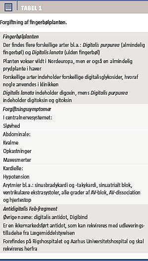 Forgiftning med digitalisglykosider fra planter forekommer sjældent i Danmark, men kan have fatale konsekvenser. Litteraturen på området er sparsom, men følgende råd kan gives til behandling af sådanne patienter: 1) Diagnostik baseres på anamnese, klinik og ekg-forandringer – S-digoxin anvendes kun til at fastslå tilstedeværelse eller ej af digitalisglykosider, 2) der bør altid gives aktivt kul, evt. flere gange, 3) i tilfælde af maligne arytmier eller hjertestop suppleres behandlingen med Digibind, og 4) ved tvivl om bedste håndtering: kontakt Giftlinjen.