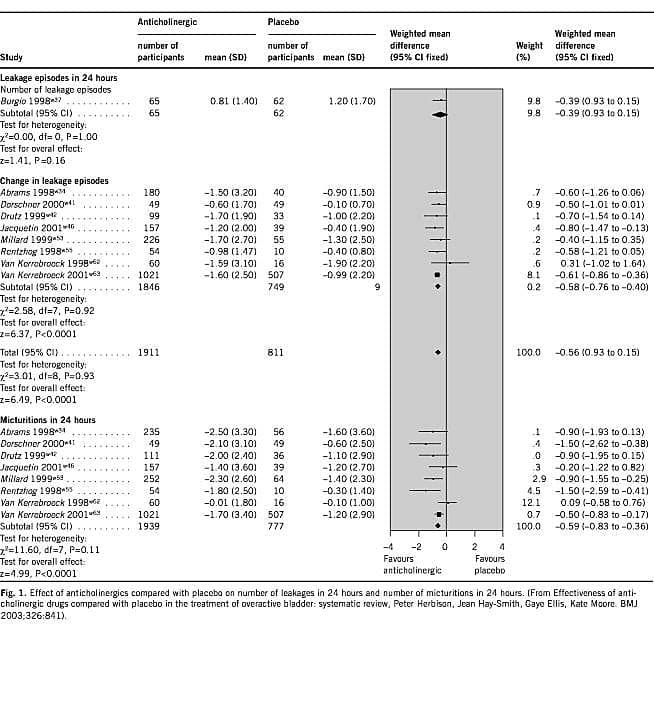 - Herbison P, Hay-Smith J, Ellis G et al. Effectiveness of anticholinergic drugs compared with placebo in the treatment of overactive bladder: systematic review. BMJ 2003;326:841-4.