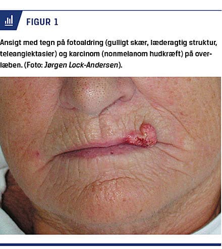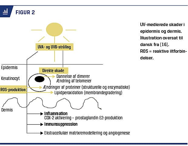 inflammation samt dannelse af UV-inducerede DNA-læsioner. UVC når ikke atmosfæren og har således ingen indvirkning på kroppens DNA [12 , 13]. Populært kan man sige, at UVA hovedsageligt skader kollagenet og fører til rynkedannelse og fotoaldring (Figur 1), mens UVB fremkalder den erytematøse reaktion (»solskoldning«). Begge typer UVR er dog associeret til hudkræft [13].