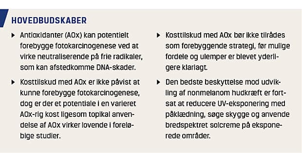 AOx formodes at kunne beskytte mod både fotokarcinogenese og fotoaldring ved at reducere oxidativt stress og således forebygge ROS-inducerede skader. Studierne af AOx’s effekt på udvikling af MM har dog været fåtallige og med modstridende resultater og bliver således ikke beskrevet yderligere. Nærværende artikel har derimod til formål kritisk at klarlægge evidensen for AOx’s effekt som kemopræventiv koststrategi, inklusive kosttilskud, eller et topikalt administreret præparat, og dermed undersøge den videnskabelige litteratur for disse supplerende strategier i forebyggelsen af NMSC.
