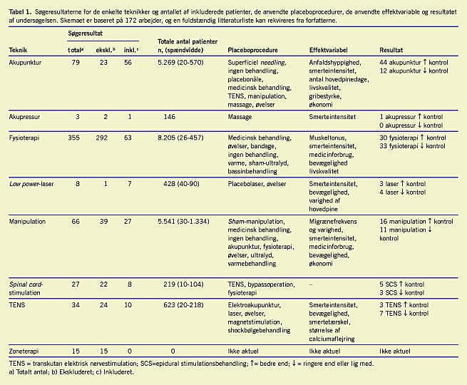 Af Tabel 1 fremgår det, at der er tre teknikker, akupunktur, fysioterapi og manipulation, for hvilke der foreligger henholdsvis 56, 63 og 27 RCT med mellem 5.269 og 8.205 patienter. For de øvrige teknikker drejer det om små materialer. Hvad angår zoneterapi, var det ikke muligt at finde kontrollerede undersøgelser. Af Tabel 2 fremgår resultaterne af SCS-behandling.
