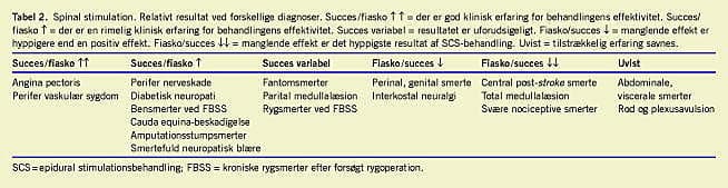 I Cochrane-review' et konkluderes det, at der er begrænset evidens for SCS ved behandling af kroniske smertetilstande. Hvad angår kroniske rygsmerter efter forsøgt rygoperation (FBSS) og complex regional pain syndrome type I (refleksdystrofi) er den foreliggende litteratur for sparsom til at man kan komme med en konklusion. Derimod synes der at være evidens for SCS ved andre iskæmiske smertetilstande [29]. Dette er i overensstemmelse med vor gennemgang, hvor vi fandt et positivt resultat i fem ud af otte undersøgelser. Epidural stimulationsbehandling (SCS) er, som vist i Tabel 2, mest effektiv ved iskæmiske smertetilstande, især intraktabel angina pectoris med en langtidseffekt på 70% [30]. Også failed back surgery er en almindelig indikation. Denne kostbare behandling hos patienter, der belaster sundhedssystemet, er vist økonomisk rentabel, hovedsagelig pga. færre indlæggelser af de pågældende patienter [31].