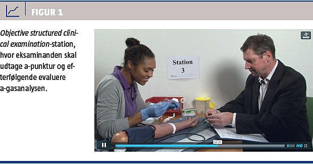 kombineret med planlægning af den videre udredningsplan. Ved den samlede vurdering indgår såvel udførelsen af den kliniske færdighed som evnen til at interagere med patient (figurant) og kollega (eksaminator). OSCE som led i lægeuddannelsen sætter øget fokus på kliniske færdigheder, som i tidligere publikationer er fundet utilstrækkelige ved egenvurdering blandt nyuddannede læger [2, 3].
