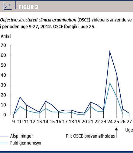 Informationsforelæsningen blev vurderet til 4 (IQR: 3-5), OSCE-videoen til 4 (IQR: 4-6) og prøve-OSCE til 6 (IQR: 5-7) (Figur 2). Prøve-OSCE blev vurderet signifikant højere end både informationsforelæsningen og OSCE-videoen (p < 0,001, Kruskal-Wallis test; p < 0,001, Mann-Whitney U-test mellem forelæsning og prøve-OSCE; p < 0,001, Mann-Whitney U-test mellem OSCE-video og prøve-OSCE; p = 0,295, Mann-Whitney U-test mellem forelæsning og OSCE-video). Videoen blev afspillet i løbet af hele semesteret, men mest i løbet af de sidste to uger inden afholdelsen af OSCE i juni 2012, hvor videoen blev afspillet 105 gange og set helt igennem 51 gange (Figur 3).