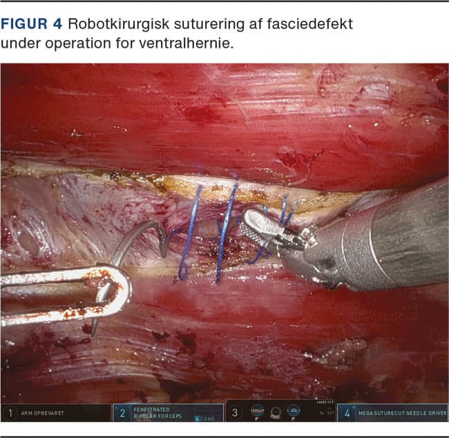 Den store fordel ved robotkirurgisk vs. laparoskopisk operation på hernieområdet antages at være hos patienter, der opereres for ventralhernie (Figur 4). De robotkirurgiske instrumenter gør suturering og dissektion i bugvæggen væsentligt lettere og giver mulighed for avancerede rekonstruktioner, der ellers kun foretages ved åben adgang. I to RCT fra USA har man sammenlignet laparoskopisk og robotkirurgisk operation for ventralhernie og fandt ingen forskel i hverken komplikationsrater eller den patientrelaterede livskvalitet [14, 15]. Et fælles kritikpunkt for disse studier er, at der anvendes simpel intraperitoneal onlay mesh-teknik, hvilket ikke udnytter robottens tekniske fordele [16]. Mindre, retrospektive opgørelser viser lovende resultater efter operation for stort incisionalhernie, hvor patienter, der har fået foretaget robotkirurgisk bilateral component-separation, udskrives efter én sammenlignet med fire dage efter tilsvarende åben operation samtidig med færre postoperative smerter og nedsat risiko for sårkomplikationer [17].