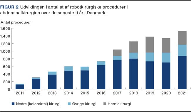 Dog er der fortsat debat om nytteværdien af robotten inden for abdominalkirurgi i forhold til konventionel laparoskopi, og det er uklart, om de øgede omkostninger, der er forbundet med robotkirurgi, står mål med eventuelle gevinster [3, 4]. Desuagtet er der på nuværende tidspunkt i Danmark 26 da Vinci-robotkirurgiskesystemer fordelt på 15 hospitaler, og antallet af robotkirurgiske procedurer er steget markant over de seneste ti år (Figur 2). Formålet med denne artikel er – med udgangspunkt i de enkelte abdominalkirurgiske fagområder – at give et overblik over anvendelsen af robotkirurgi og den tilgængelige evidens.